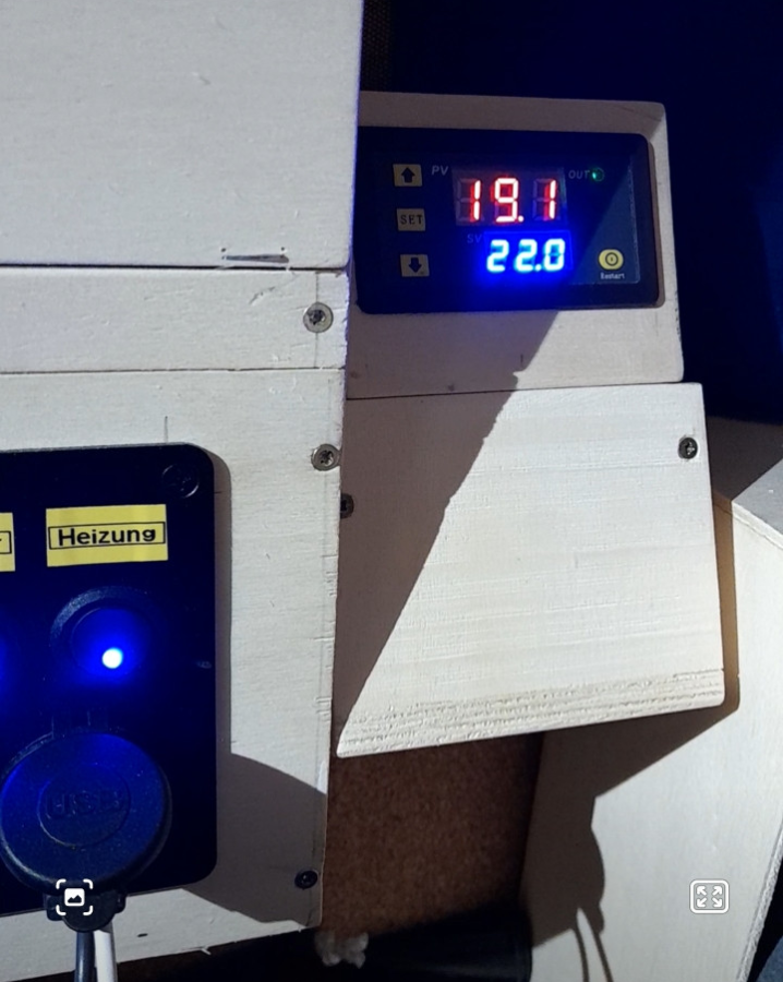In dem Neuen habe ich jetzt statt 1,5 cbm 3 cbm Volumen durch den Auszug, hier reicht die kleine E-Heizung nicht mehr so gut aus. Jetzt habe ich einen 400 Watt 230v Heizlüfter.