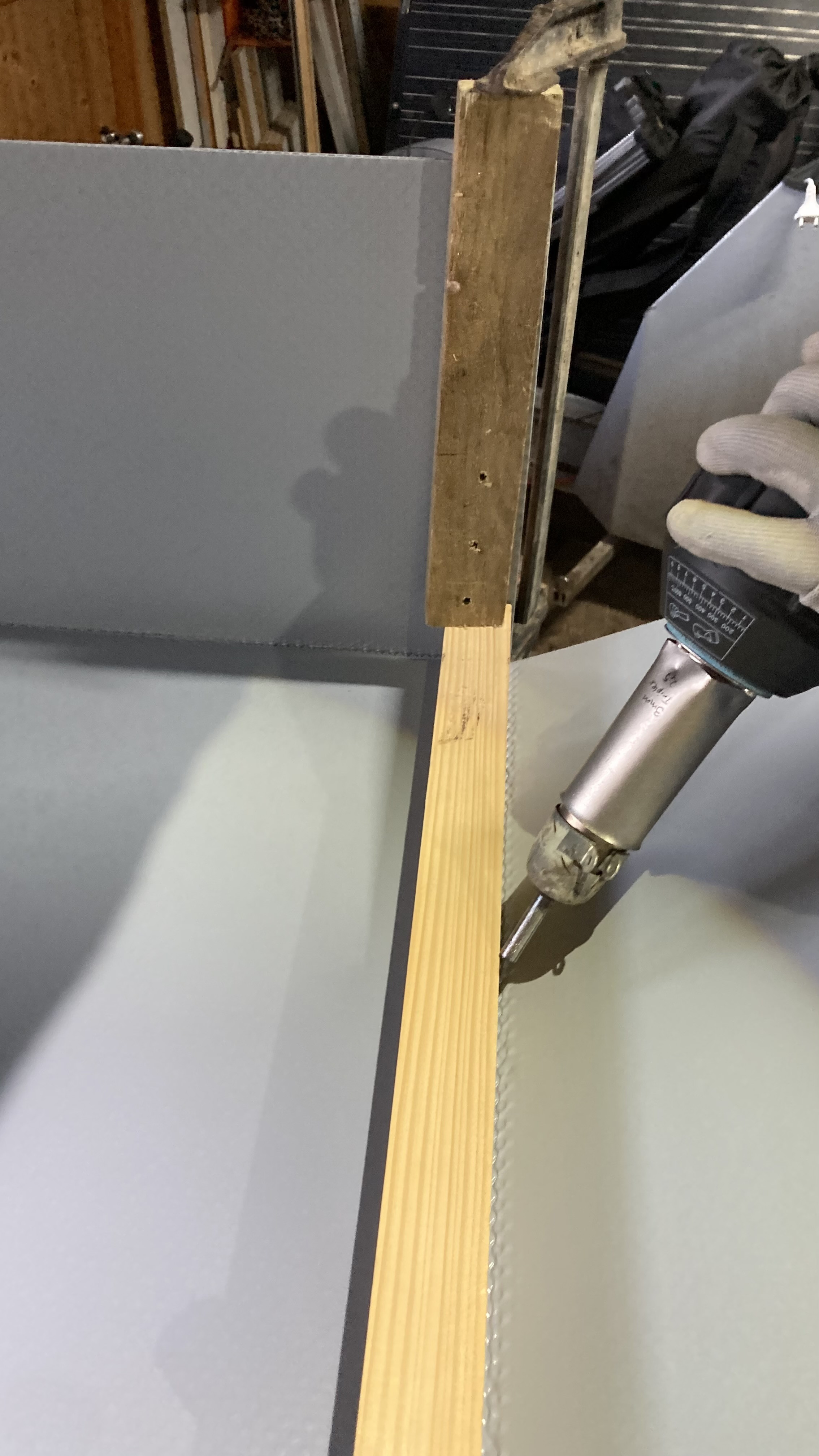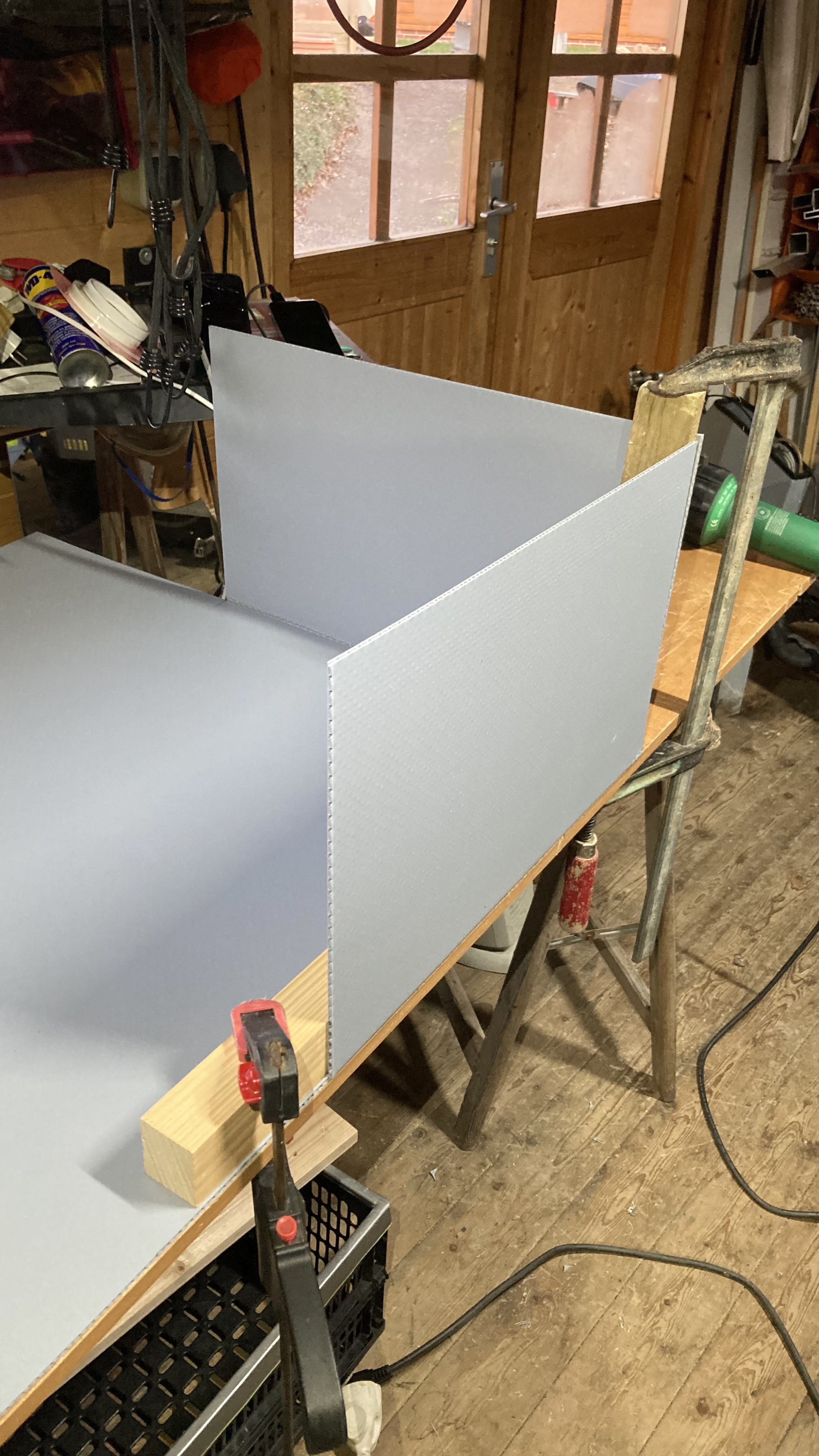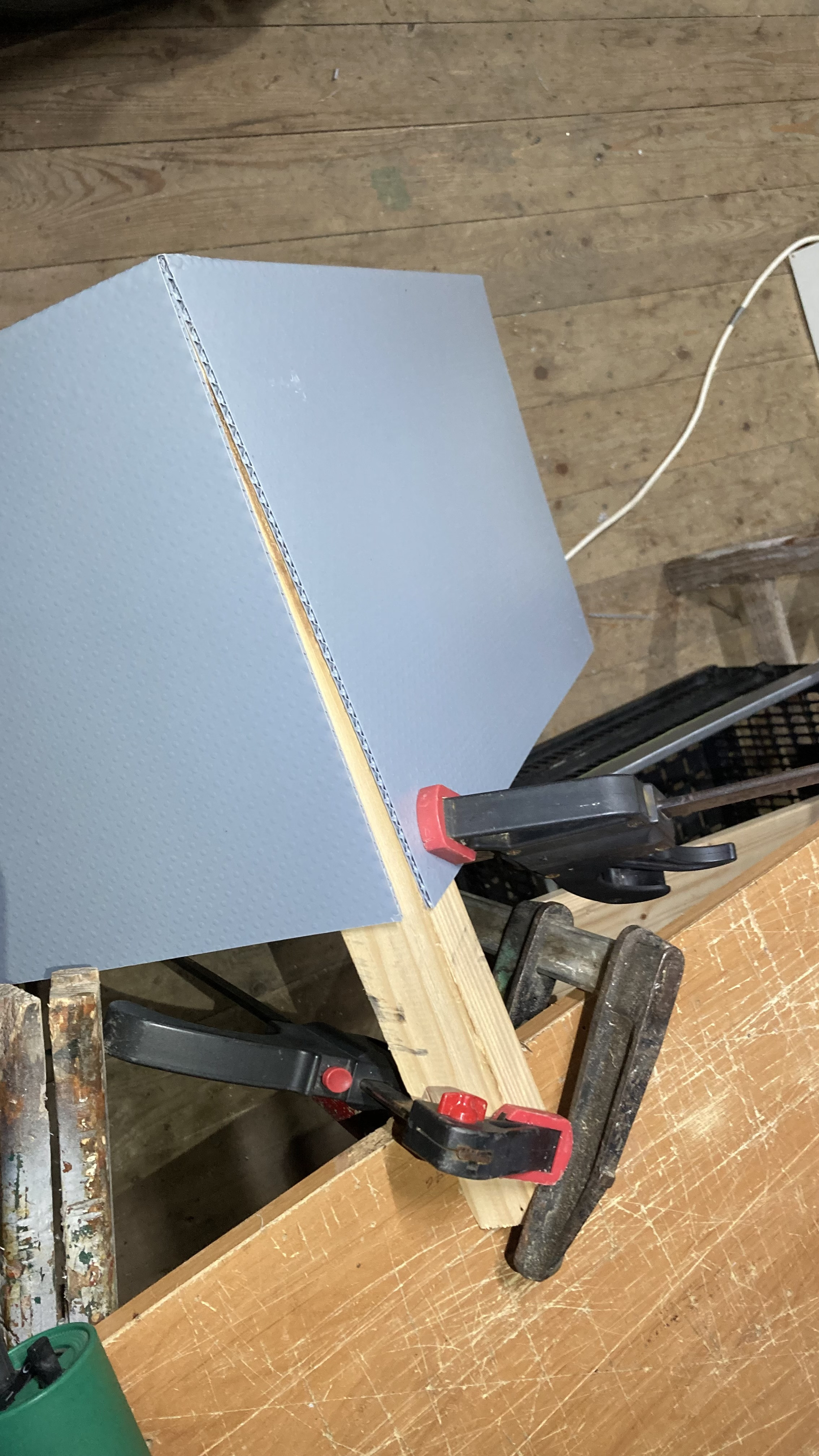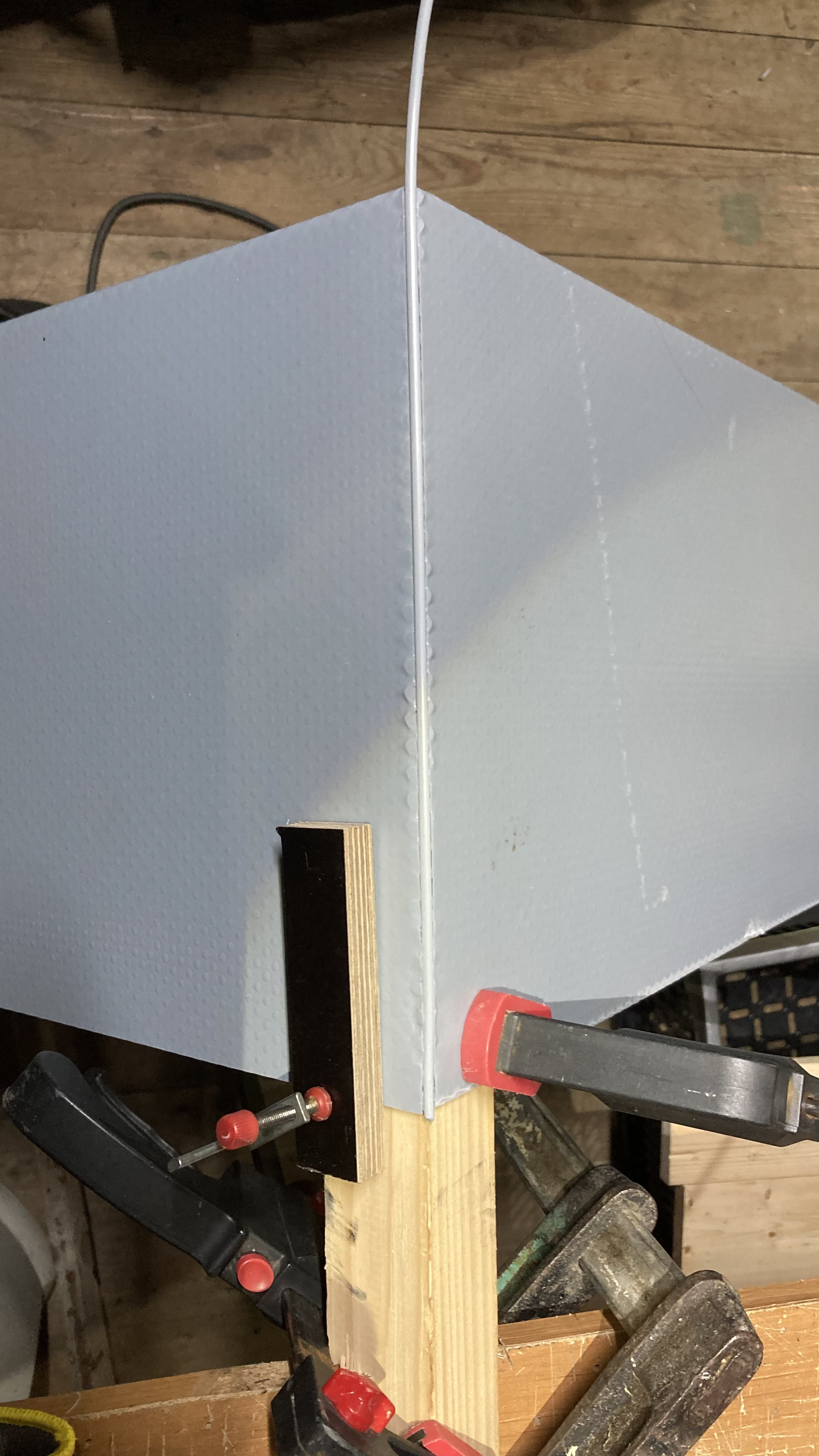 Die Außennaht wird dann auch auf eine Holzkante gespannt. Dann kann man so heiß schweißen, dass man ohne Holz durchbrechen würde. Anschließend wird innen noch mal geschweißt. Möglichst immer mit einer Holzplatte hinter der Naht 😉