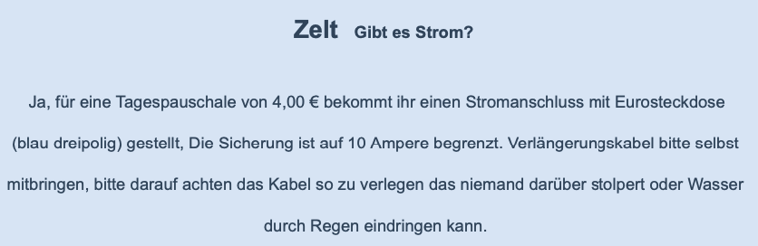 Riffi Riffi "Gibt es Strom, wenn ja, welcher Anschluß, Schuko oder CEE Blau?" Habe mal selbst geschaut und eine Antwort gefunden: